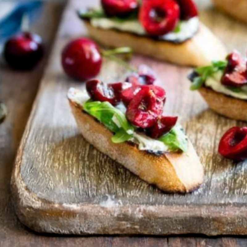 - Para o creme: misture todos os ingredientes, prove e ajuste os temperos. Espalhe o creme branco sobre as torradas. Adicione as cerejas fatiadas por cima.