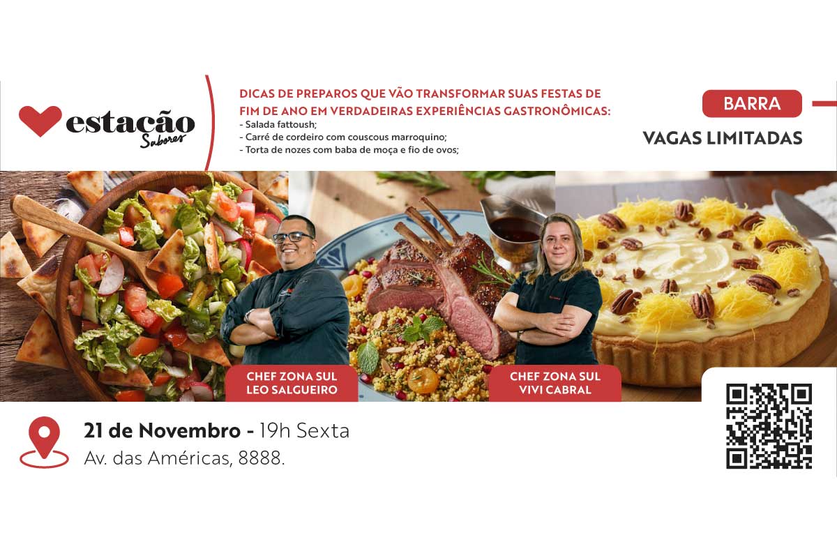 Para inspirar as celebrações de fim de ano, os Chefs Zona Sul Leo Salgueiro e Vivi Cabral conduzem uma experiência repleta de aromas, cores e tradições à mesa. Nesta aula, eles apresentarão sugestões de preparos que unem sofisticação, sabor e o espírito das festas.