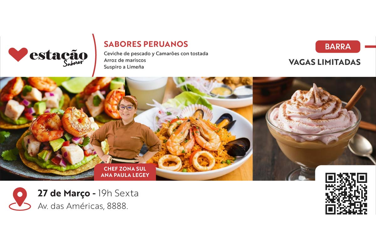 Aula Estação Sabores: Sabores Peruanos – Ceviche de pescado, Arroz de mariscos e Suspiro a Limeña