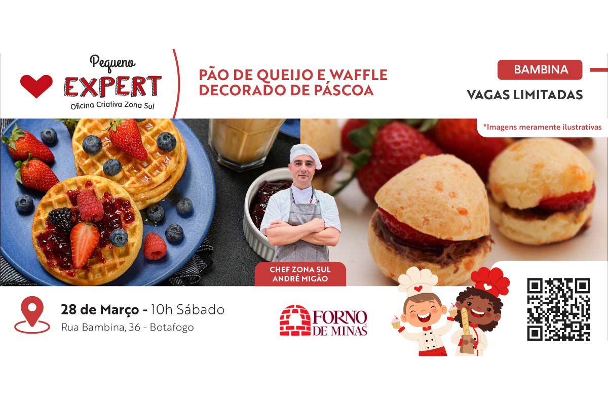 Nesta oficina especial de Páscoa, as crianças vão colocar a mão na massa e aprender a preparar pão de queijo e waffle decorada, de forma lúdica e cheia de criatividade, ao lado do Chef André Migão.