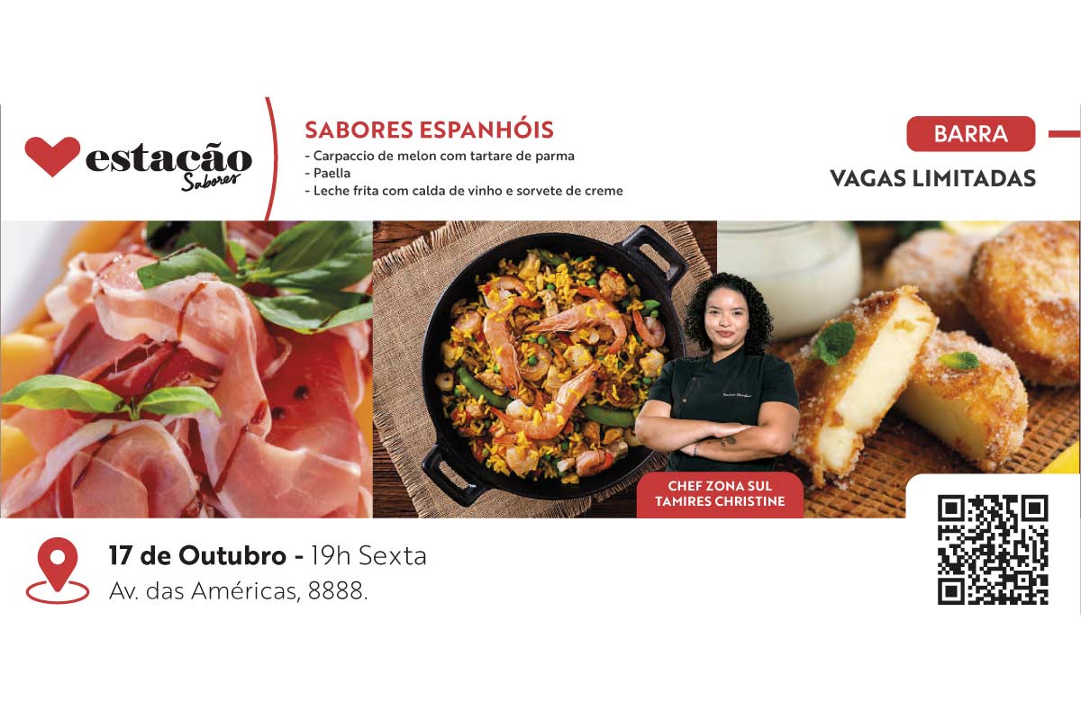 O percurso começa com a leveza e sofisticação do Carpaccio de Melon com Tartare de Parma, segue para o prato mais emblemático da Espanha, a Paella, que reúne ingredientes frescos em uma explosão de sabor e textura, e finaliza com a doçura marcante da Leche Frita com Calda de Vinho e Sorvete de Creme.