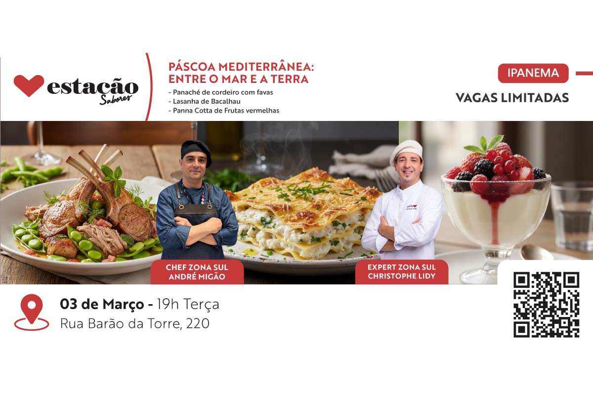 Uma aula que celebra a riqueza dos ingredientes e a simbologia da Páscoa através de preparos que unem tradição e elegância. Nesta aula gastronômica de Páscoa, você é nosso convidado para viver uma experiência prática, saborosa e inspiradora ao lado do Expert Christophe Lidy e do Chef Zona Sul André Migão. Juntos, eles irão ensinar preparos clássicos e cheios de […]