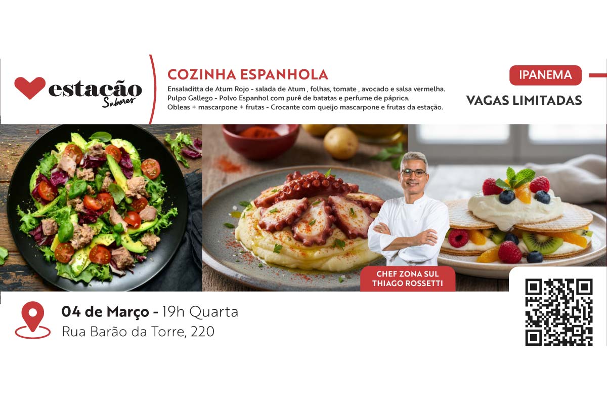 Nesta aula gastronômica dedicada à cozinha espanhola, você vai viajar pelos sabores do Mediterrâneo ao lado do Chef Zona Sul Thiago Rossetti. Com técnica, identidade e simplicidade elegante, o chef ensinará preparos cheios de frescor e personalidade, perfeitos para serem reproduzidos em casa. No menu,teremos como entrada a leveza da Ensaladitta de Atum Rojo (Salada de atum, folhas, […]