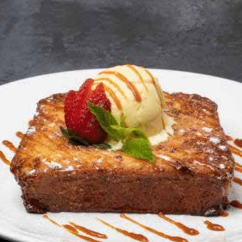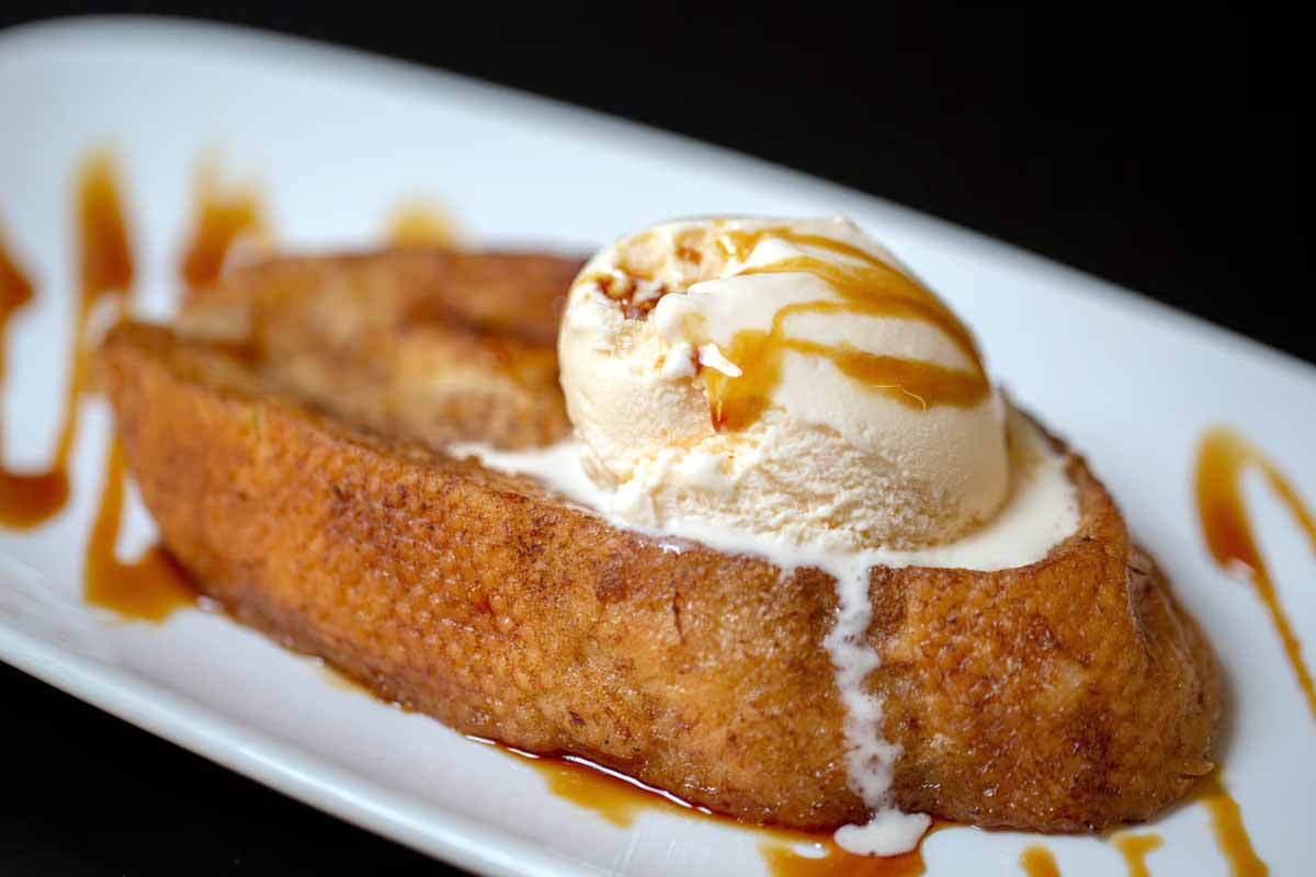 Croutons de rabanada e xarope de licor de doce de leite com sorvete