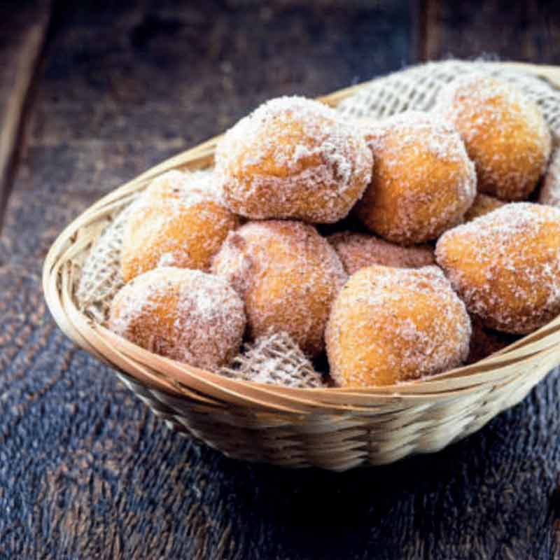 2. Empane os bolinhos com açúcar cristal, coco ralado industrial e canela em pó. Frite em óleo ou gordura quente até dourar. Sirva ainda quentinho!